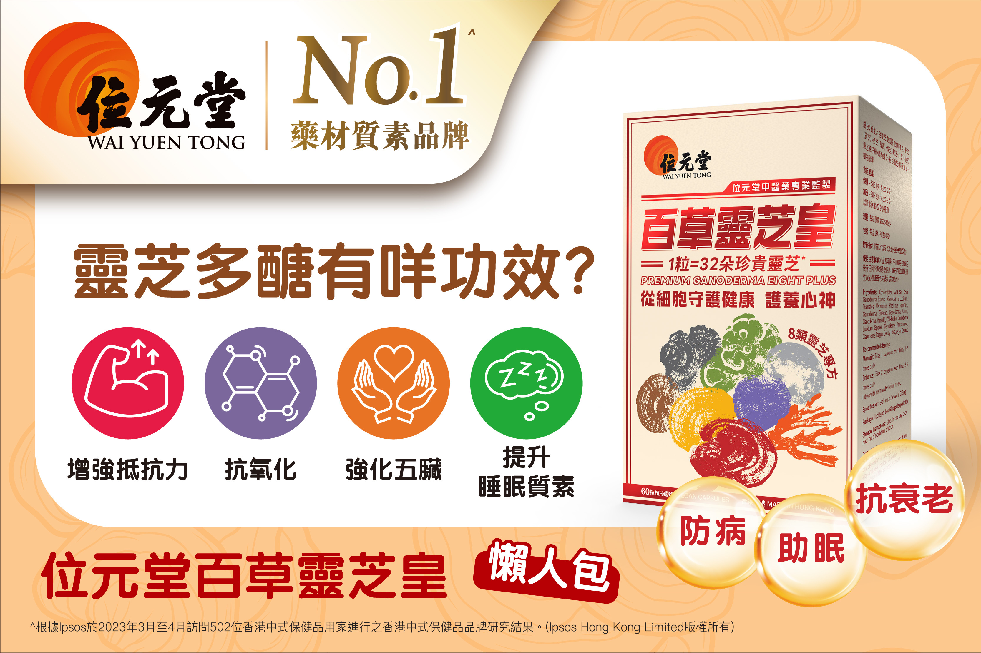 百草靈芝皇——8類靈芝專方,結合6種野生靈芝、2種功效靈芝及>99%破壁靈芝孢子,靈芝多醣含量全港No.1^ ,並通過222項檢測確保品質。